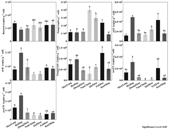 Microbial gene abundance at Shenyang, Beijing, Zhengzhou, Nanchang, Quzhou, Fuzhou, and Kunming sites. Vertical bars represent the standard deviations of the mean (n = 3). Different lowercase letters above bars indicate statistically significant differences (p < 0.05).