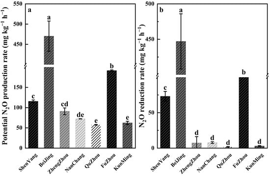 Beijing demonstrated the highest potential N2O production rate (470 mg kg−1 h−1) and N2O reduction rate (447 mg kg−1 h−1) among the soils (Figure 4). In contrast, Zhengzhou, Nanchang, Quzhou, and Kunming exhibited relatively low potential N2O production rate (57–90 mg kg−1 h−1) and reduction rate (1–7 mg kg−1 h−1). Notably, Fuzhou exhibited both a high potential N2O production rate (191 mg kg−1 h−1) and reduction rate (107 mg kg−1 h−1).