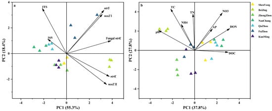 Principal Component Analysis (PCA) of microbial gene abundances (a) and soil chemical properties (b). The PCA illustrates the dominant patterns of variation in quantitative gene data (including bacteria, fungi, and nirS, nirK, fungal nirK, nosZ I and nosZ II) and soil chemical properties, with axes representing the principal components explaining the highest proportion of variance (percentage values shown).