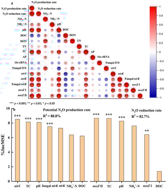 Pearson correlation analysis demonstrated significant (p < 0.001) positive correlations between potential N2O production rates and the abundances of N2O production-related genes, which include nirS, nirK, and fungal nirK (Figure 6a). N2O reduction rates were significantly correlated with nosZ gene abundances (both clade I and II). Significant positive correlations were observed between potential N2O production rates, N2O reduction rates, and specific soil chemical properties, including TC, pH, and NH4+-N. The abundance of N2O production-related genes (nirS, nirK, and fungal nirK) was significantly correlated with TC and pH, whereas nosZ gene abundances were significantly correlated with pH, TC, and NH4+-N.