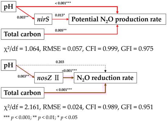 Total carbon demonstrated a significant positive direct effect on N2O reduction (p < 0.001), while the nosZ II gene abundance also directly promoted N2O reduction (p < 0.001). pH indirectly enhanced N2O reduction by positively influencing nosZ II abundance (p = 0.003).