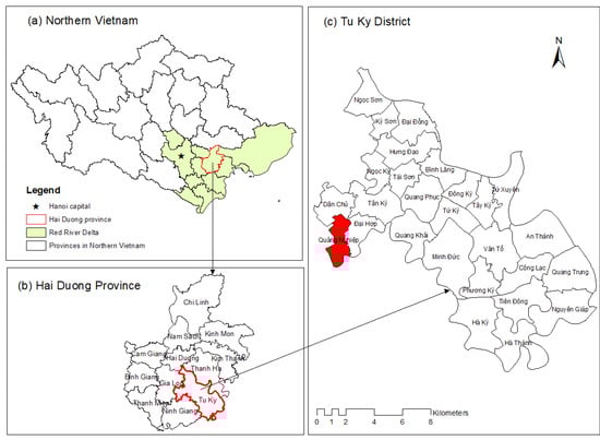 A map showing the location of (a) the RRD and Hai Duong province in northern Vietnam, (b) Tu Ky district within Hai Duong province, and (c) the surveyed area in Tu Ky district, highlighting Quang Nghiep commune.