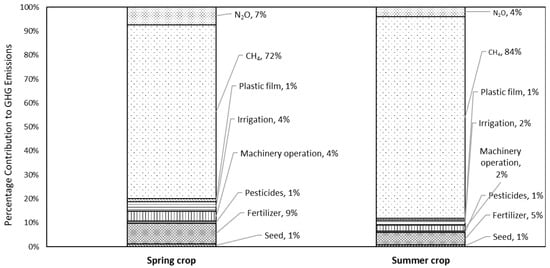 The contribution of different nitrogen sources to the total GHG emissions in spring and summer crops.