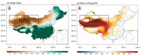 Simulating precipitation over arid and semi-arid regions remains one of the most persistent challenges in current climate modeling, due to the complex interplay between surface dryness, atmospheric stability, and aerosol–cloud interactions [1,2]. In dryland regions such as Northwest China, where convective precipitation is infrequent yet critically important, even minor shifts in thermodynamic conditions can lead to large differences in rainfall occurrence and intensity [3,4]. Precipitation here is modulated by a range of tightly coupled processes, including land–atmosphere exchange, moisture availability, and cloud microphysics. Among these, interactions involving atmospheric aerosols—particularly their roles in cloud formation and convective suppression—are increasingly recognized but remain poorly constrained in global climate models [5,6]. This makes precipitation projections over arid zones especially uncertain.