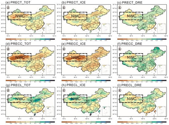 To explore whether more detailed dust–cloud interactions can reduce the wet bias, we conducted a series of sensitivity experiments using CAM5, including a control run with all dust effects (TOTAL), a simulation with dust removed (NODUST), and a simulation excluding only ice-nucleation effects of dust (NOICE). Figure 2 shows the spatial distribution of dust effects on annual mean precipitation, focusing on three precipitation components: PRECT, PRECC, and PRECL. The dust total effect (TOTAL-NODUST; Figure 2a–c) leads to a notable reduction in precipitation over Northwest China, particularly through suppression of convective rainfall. Further decomposition reveals that the dust–ice-cloud effect (TOTAL-NOICE; Figure 2d–f) is the primary driver of this reduction, especially in PRECC, while the direct radiative effect (NOICE-NODUST; Figure 2g–i) contributes only marginally to precipitation changes in this region. A two-tailed Student’s t-test at the 99% confidence level was applied to assess the statistical significance of differences between the sensitivity experiments. These rigorous statistical tests help to ensure the robustness and reliability of our model results. These results highlight the dominant role of dust-induced ice nucleation in modulating cloud microphysics and reducing precipitation efficiency.