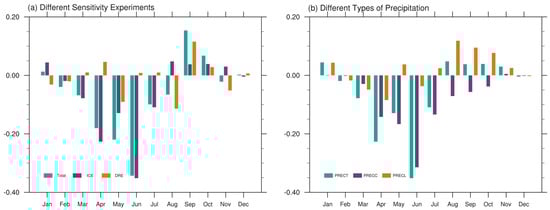 To further clarify the seasonal characteristics of dust–cloud interaction impacts on precipitation, Figure 3 presents the monthly evolution of dust-induced changes over the Northwest China region. As shown in Figure 3a, the total dust effect (green bar) leads to a clear reduction in precipitation during the spring and early summer (March to July), with the ice-cloud effect (purple bar) accounting for the majority of this reduction. In contrast, the direct radiative effect (orange bar) shows only minor fluctuations and negligible contribution to the total reduction. Figure 3b further disaggregates the monthly evolution of the dust–ice-cloud effect into individual precipitation components. It reveals that the spring–summer reduction in PRECT is primarily driven by a sharp decline in PRECC, while changes in PRECL are minimal. These results suggest that dust-induced ice nucleation suppresses convective development, thereby reducing rainfall efficiency during the convective season.