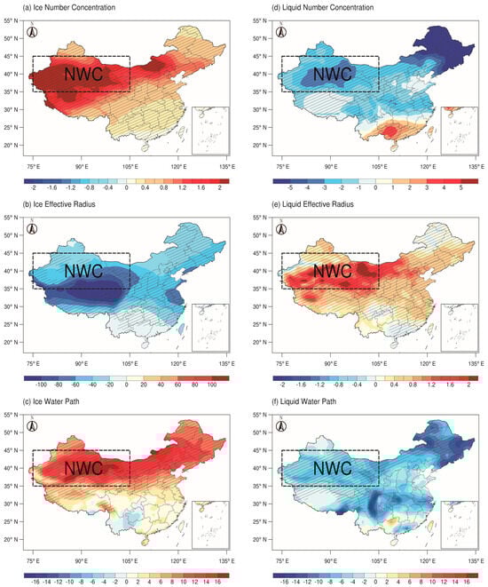 Cloud-top microphysical responses of cloud properties to dust-ice-cloud interactions during March–July over Northwest China. (a–c) Changes in ice-cloud number concentration (INNC, cm−3), ice effective radius (Rei, µm), and ice water path (IWP, g m−2). (d–f) Changes in liquid cloud droplet number concentration (CDNUMC, cm−3), liquid effective radius (Re, µm), and liquid water path (LWP, g m−2). All shaded regions with black hatching indicate 99% significance.