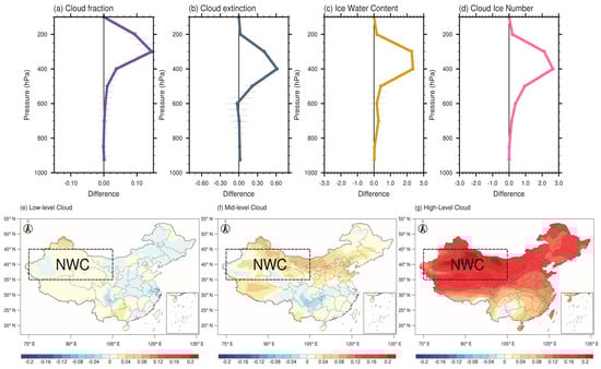 Figure 5e–g display the spatial distribution of changes in low-level, mid-level, and high-level cloud cover, respectively. While dust–ice interactions do not produce significant changes in low-level clouds over Northwest China, both mid-level and especially high-level cloud cover exhibit marked increases across the arid region. This is particularly evident in the Tarim Basin and Hexi Corridor, where high cloud amounts are significantly enhanced. These spatial patterns are consistent with the vertical cross-sections and the microphysical responses observed in Figure 4, further corroborating that dust primarily influences high-level ice clouds in this region.
