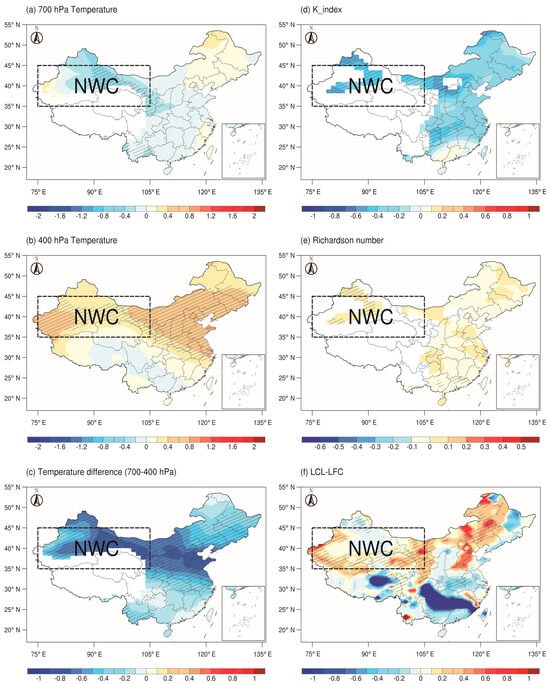 Cloud-induced thermodynamic responses to dust–ice-cloud interactions during March–July over Northwest China. (a–c) Changes in temperature at 700 hPa, 400 hPa, and the vertical temperature difference between 400 hPa and 700 hPa (ΔT700–400, K); (d,e) changes in atmospheric stability indices: K index (K) and Richardson number (Ri); (f) changes in the vertical distance between the lifting condensation level (LCL) and the level of free convection (LFC, hPa). All shaded regions with black hatching indicate 99% significance.