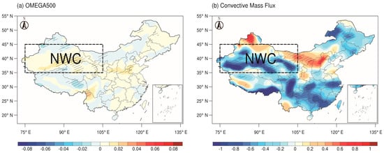 As a direct response to the dust-induced thermodynamic stabilization, both large-scale and convective vertical motions experience substantial weakening over Northwest China. Figure 7a displays positive anomalies in 500 hPa vertical velocity (Ω) during March–July, signifying a notable reduction in upward motion under dusty conditions. This suppression of vertical ascent hampers the vertical transport of heat and moisture, thereby inhibiting the development and sustenance of convective systems. Correspondingly, the vertical profile of convective mass flux (CMF) shown in Figure 7b exhibits a widespread decrease throughout the troposphere. The reduction in CMF reflects diminished buoyancy and convective vigor, indicating a weakened capacity for latent heat release and vertical momentum transfer. Together, these results illustrate a reinforcing feedback loop initiated by DICI: microphysical changes enhance thermodynamic stability, which in turn suppresses vertical motion and moisture convergence, ultimately leading to decreased convective activity and rainfall over the arid region.