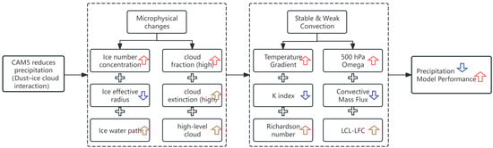 Figure 8 presents the conceptual mechanism underlying the improved precipitation simulation achieved by incorporating dust–ice-cloud interactions into the CAM5 model. This mechanism demonstrates how dust aerosols, acting as efficient ice-nucleating particles, modify both the microphysical structure of clouds and the thermodynamic stability of the atmosphere, ultimately reducing the longstanding wet bias in precipitation over Northwest China and enhancing model accuracy. From a microphysical perspective, the presence of dust leads to a significant increase in the number concentration of ice crystals, while simultaneously decreasing the effective radius of these ice particles. This shift enhances ice-cloud formation and increases the optical thickness of high-level clouds. Consequently, the ice water path becomes larger, and high cloud cover increases, accompanied by stronger extinction coefficients associated with these clouds. These physically coherent changes indicate a more realistic representation of the cloud system in dust-laden conditions. From a dynamical and thermodynamic standpoint, the presence of dust-induced ice clouds contributes to changes in atmospheric vertical structure. The temperature lapse rate becomes steeper, the K index—a measure of convective potential—decreases, and the Richardson number increases, all of which suggest a more stable atmosphere. Additionally, vertical motion at 500 hPa shows a stronger downward tendency, convective mass flux is reduced, and the lifting of air parcels to form deep clouds becomes more difficult. These conditions collectively inhibit the development of deep convection, making precipitation less likely. Importantly, these mechanisms are most prominent during the March to July period, when both dust loading and convective activity reach seasonal peaks. The improvements in precipitation simulation manifest not only in total rainfall amounts but also in the separate convective and large-scale components, confirming that dust–ice interactions influence both cloud microphysics and larger-scale atmospheric dynamics. The consistency of these findings across multiple physical variables reinforces the credibility of the proposed mechanism illustrated in Figure 8.