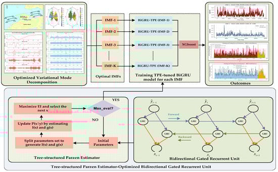 - Each IMF is modeled independently using a bidirectional gated recurrent unit (BiGRU) network [22,31,32]. This structure captures temporal dependencies in both forward and backward directions and adapts to the evolving nature of the underlying patterns across different IMFs. Hyperparameters for BiGRUs are selected through the Tree-structured Parzen Estimator (TPE) [33,34] to maintain balance between generalization and responsiveness to localized fluctuations in the data.