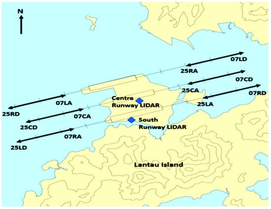 Hong Kong International Airport (HKIA) is the primary aviation hub for Hong Kong, located on the northeastern edge of Lantau Island. The site was developed through large-scale land reclamation along the subtropical coastline of southern China, as shown in Figure 1. Its location near major commercial centers in the Asia–Pacific region gives it a strategic advantage in international air traffic flow [24]. It is equipped with advanced infrastructure and a well-planned layout. The HKIA ranks among the world’s top airports for both passenger traffic and cargo volume. Hong Kong International Airport operates three parallel runways designated 07L/25R, 07C/25C, and 07R/25L, oriented approximately east to west. This configuration supports independent parallel operations, allowing simultaneous takeoffs and landings during standard conditions and contributing to increased airfield capacity. Runway 07R/25L, located on the southern edge of the airfield, lies closest to the passenger terminals and cargo facilities. Its position shortens taxi distances and facilitates efficient movement of both passenger and freight aircraft. The central runway, 07C/25C, was originally designated 07L/25R. It was renamed in December 2021 after the addition of the third runway to reflect its central position within the layout. This runway was temporarily closed for reconfiguration and resurfacing and resumed operations on 28 November 2024. Runway 07L/25R, situated on the northern side of the airport, is the newest of the three and was developed as part of the Three-Runway System (3RS) project.