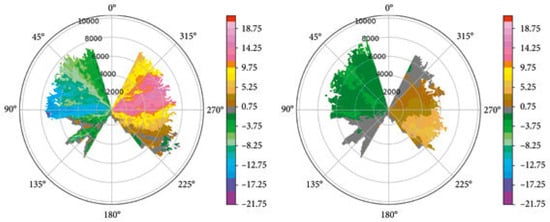 Figure 4 shows the radial wind velocity in knots, as recorded by the Doppler LiDAR at the HKIA. The system uses the PPI mode at a 3° elevation angle and scans slant ranges between 350 m and 10,000 m. Warm colors such as yellow, orange, pink, and brown represent positive velocities, where wind moves away from the LiDAR. Cool colors such as green, blue, and purple indicate negative velocities, where wind moves toward the LiDAR. Each PPI scan consists of 400 to 500 laser beams and takes about 20 to 30 s to complete. Blank sectors at longer slant ranges reflect areas where the surrounding terrain blocks the line of sight of the LiDAR, leading to missing data.