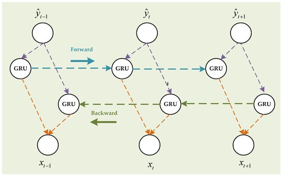Let the input sequence for the IMF be , where the goal is to generate the predicted sequence , approximating the ground truth values . At each time step , the BiGRU processes the input from both temporal directions, as shown in Figure 5. The forward hidden state for the IMF is computed as Equation (9) and simultaneously, the backward hidden state is derived by Equation (10).
