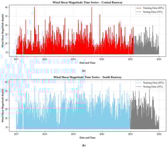 Time series of wind shear magnitudes at HKIA with data split: (a) central runway with 85% training (red), 15% testing (gray); (b) south runway with 85% training (blue), 15% testing (gray).