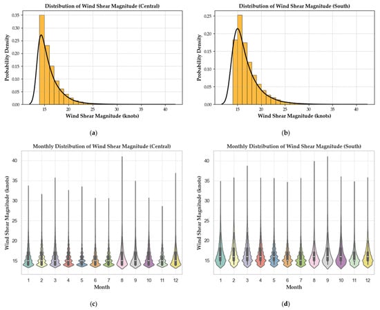 Figure 7a,b presents the probability distribution of wind shear magnitudes for the central and south runways, respectively, using histograms with kernel density estimates (KDEs). Most wind shear magnitudes fall between 14 and 18 knots, forming positively skewed distributions. The south runway shows a broader spread and higher frequency of extreme values, indicating greater variability in wind behavior near this zone.