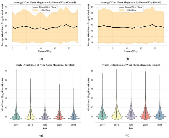 Figure 7c,d illustrates the monthly distribution of wind shear magnitudes across the two runways using violin plots. The central runway displays consistent distributional patterns throughout the year, with stable medians and compact interquartile ranges. In contrast, the south runway exhibits higher variability and a slight upward shift in median magnitudes between July and September, potentially influenced by seasonal factors such as convective activity or thermal gradients near the southern approach paths. Figure 7e,f depicts hourly trends in average wind shear magnitude along with one standard deviation envelopes. Both runways show limited diurnal variation, though a slight bimodal structure is observable, particularly at the central runway. The south runway reveals higher overall mean values and broader variability in the late afternoon and evening hours, which may relate to localized effects including terrain-induced turbulence or boundary layer transitions.