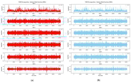 The optimal number of IMFs for each runway is determined using the mutual information (MI) criterion [41], which helps identify the point at which added components no longer contribute significant new information. This analysis yields six IMFs for the central runway, as well as six IMFs for the south runway. Similarly, for the central runway, the decomposition is carried out with a moderate bandwidth constraint (α = 1500), no noise tolerance (τ = 0), initial center frequency ω0 = 1, and a convergence tolerance of 1 × 10−7. In contrast, the south runway exhibits better decomposition performance under a higher bandwidth constraint (α = 2000), a small noise tolerance (τ = 1 × 10−6), and the same initialization and convergence tolerance values (ω0 = 1; tolerance = 1 × 10−7). Figure 8 shows the resulting IMFs from the central and south runway decomposition. Each subplot corresponds to a specific IMF, capturing oscillatory behavior at distinct frequency scales. These components are subsequently used as inputs to the forecasting model, allowing the learning framework to focus on frequency-localized features that are otherwise difficult to capture from raw time series data.