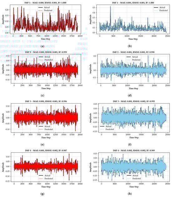Figure 9a,b presents the results for IMF-1 extracted from the central and south runway wind shear time series. As the highest-frequency component, IMF-1 reflects rapid fluctuations and short-term variability within the original signal. The OVMD–BiGRU–XGBoost model provides highly accurate predictions in both cases. For the central runway, the model outputs an RMSE of 0.000 and an R2 value of 1.000, while the south runway results indicate an RMSE of 0.001 with the same R2. The predicted values closely follow the actual sequence, showing that the model captures the intricate details associated with high-frequency dynamics. Similar patterns appear in IMF-2 results shown in Figure 9c,d, where slightly lower frequency signals are involved. Despite this, the model maintains excellent performance with RMSE values of 0.001 and R2 values of 0.999 across both runways. These outcomes affirm the model’s strength in addressing short-term patterns across diverse datasets.