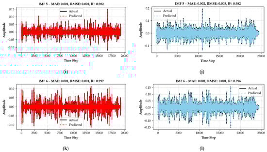 Actual vs. predicted IMF components using OMD–BiRGRU–XGBoost model: (a) IMF-1—central runway; (b) IMF-1—south runway; (c) IMF-2—central runway; (d) IMF-2—south runway; (e) IMF-3—central runway; (f) IMF-3—south runway; (g) IMF-4—central runway; (h) IMF-4—south runway; (i) IMF-5—central runway; (j) IMF-5—south runway; (k) IMF-6—central runway; (l) IMF-6—south runway.