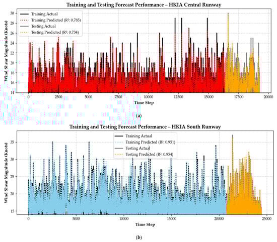 Figure 10a,b illustrates the final reconstructed performance of the proposed OVMD–BiGRU–XGBoost framework for wind shear magnitude prediction at the HKIA. In Figure 10a, the model’s output for the central runway displays reasonable alignment with the observed values across both training and testing phases. The R2 values reach 0.773 during training and 0.729 during testing, indicating a reliable learning of temporal dependencies despite the irregular and sharp fluctuations inherent in wind shear data. Similarly, Figure 10b demonstrates stronger predictive ability for the south runway, with R2 values of 0.921 and 0.926 for training and testing data, respectively. The visual overlap between the predicted and actual series remains high across the entire time span, especially in the testing zone, where the model maintains close adherence to peak intensities and trough transitions. These results reflect the ability of the proposed framework to generalize across different runway conditions and to capture both localized variability and broader structural patterns within the wind shear time series.