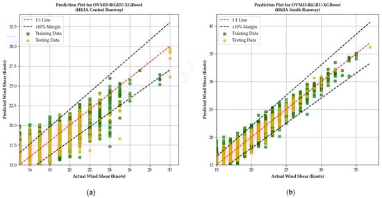 Figure 11a,b presents the prediction error plots for the OVMD–BiGRU–XGBoost model on the central and south runways, respectively. In both cases, the predicted wind shear values closely match the actual observations. Most data points align along the 1:1 reference line and remain within the ±10% error margin, indicating minimal deviation. Both training and testing sets follow a clear pattern across the range of wind shear values. These results confirm that the model maintains reliable accuracy under varying runway conditions and avoids large prediction errors.