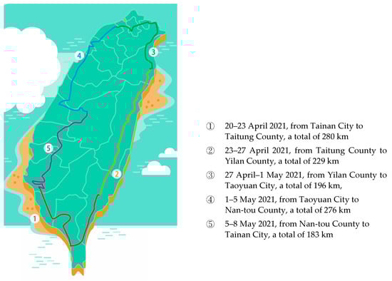 Large-area outdoor activities (torch relay of games, hiking/climbing/cycling around the island, cross country, etc.) involve participants of different backgrounds, endurance training levels, ages, genders, and nationalities. In this study, the 2021 Torch Relay Round the Island, Taiwan, was selected as a case study for the thermal assessment of large-area and long-duration outdoor events. There were more than 60 torchbearers and 10 bicycle riders participating, and every participant voluntarily joined, including college students, graduated alumni, running enthusiasts, and local residents. Participants of all genders, aged between 20 and 50 years old, were involved in this event. Age and gender differences can affect the results of thermal discomfort analysis: the elderly and infants have a poorer perception of the thermal environment [50,51,52], and even with the same weight, females tend to have less muscle mass to generate body heat. Therefore, males tend to feel hotter in the same thermal environment [53].