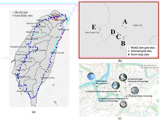(a) The blue dots represent the 142 sites of the torch relay route surrounding Taiwan, and the grey dots are TReAD grids. (b,c) Selection of the nearby TReAD sites for the A-B-C-D-E route. Adapted from Yu et al. (2021), Figures 1a, 4, and 6a [15].
