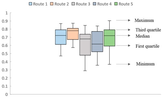 As shown in Figure 3, the SVF distributions in Routes 3, 4, and 5 are more diverse than those in Route 1 and 2, revealing the different urban compactness archetypes in different parts of Taiwan. Route 1 and 2 covered most of southern and eastern Taiwan, where the built types are relatively open and separate. Route 3, 4, and 5 passed from northern to western Taiwan and covered the most developed cities from medium- to high-level compactness.