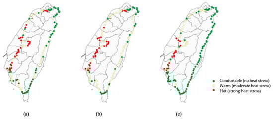 People from different regions might have different feelings and tolerances to heat. For example, in Taiwan, “PET 34–38 °C” represents a warm state, while “PET > 38 °C” makes people feel very hot and uncomfortable. Meanwhile, “PET 29–35 °C” and “PET > 35 °C” are European classifications representing “warm” and “very uncomfortable” thermal perceptions [38,39]. According to the WBGT standard guidelines for the prevention of heat disorders published by the Japanese Ministry of the Environment and the Japan Sports Association, the risk of heat stress increases when “WBGT > 25 °C” occurs. Once WBGT reaches 28 °C, a “warning” level is reached. Warnings can be issued and adjustments can be made to mitigate thermal risks during sport events [40,41,42]. UTCI involves Ta, RH (or vapor pressure), wind speed, mean radiant temperature, metabolic rate, and clothing factors. Achieving a UTCI of 32 °C on the 10 thermal perception levels was defined as meeting the severe heat stress threshold [43,44]. A simple traffic light symbol (green: comfortable/yellow: warm/red: hot) to classify the thermal perceptions and heat stress levels among the three thermal indices is shown in Table 3.