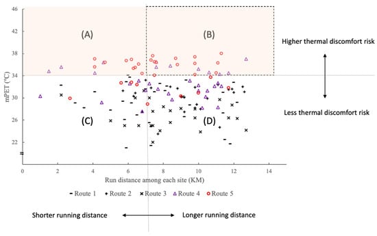 The correlation between mPET and running distance is not obvious, due to (1) the complex environmental factors affecting outdoor thermal comfort, (2) the differences in the surrounding built environment, and (3) the impact on the torchbearers exposed to the surrounding environment over time. The correlation distribution of the mPET performance and the running distance are shown in Figure 5. Areas (A) and (B) represent the sites with higher thermal risk; therefore, it is appropriate to arrange torchbearers with higher heat tolerance. As for Areas (B) and (D), it is suitable to arrange torchbearers with long-distance running experience. Since Area (B) shows a more challenging situation, torchbearers with better heat resistance and long-distance running ability are much more appropriate. Those who have a lower thermal tolerance and less running experience can be placed into Area (C).