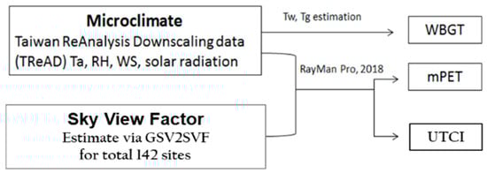 In this study, the modified Physiologically Equivalent Temperature (mPET) [37], Wet Bulb Globe Temperature (WBGT), and Universal Thermal Climate Index (UTCI) were estimated and selected as thermal indicators for the purpose of obtaining a more comprehensive perspective. These three indices consider not only the temperature but also the influence of humidity, wind speed, and radiation and are suitable for the characteristics of hot, humid areas.