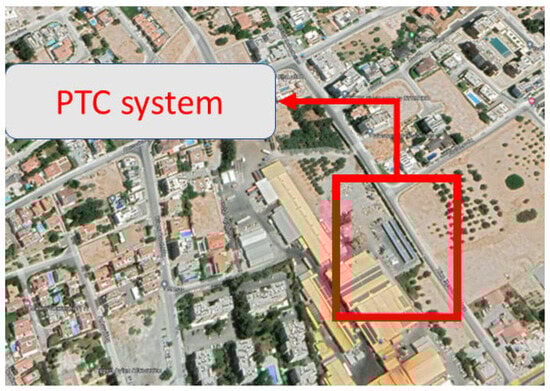 The PTC system, as shown in Google Maps in Figure 1, is situated at the KEAN factory in Limassol, Cyprus (34.41° N, 33.04° E). Due to its proximity to the sea—approximately 250 m—the PTC plant is influenced by local weather systems, such as the sea breeze. The location of the plant also contributes to the soiling on the system as it is surrounded by areas of high dust concentration, such as coastal sand. Moreover, Cyprus has an intense Mediterranean climate, characterized by hot, dry summers with frequent dust events by dust carried over from the Middle East and Sahara deserts, and mild winters from November to mid-March [27], making the estimation of soiling rate very challenging. Using a sun tracker to locate the position of the sun during the day, the PTC plant is aligned with the solar disk in order to enhance its efficiency. This results in the concentrating system receiving direct solar radiation throughout the day, so the computation of soiling mechanisms considers the change in its position during the day. In this study, the angular position of the mirrors is identified by the solar zenith angle, which is calculated within the algorithm. Location-specific data were also utilized to calculate it. Further details regarding the design and operational configuration of the PTC system can be found in previous studies by Ktistis [25,28].
