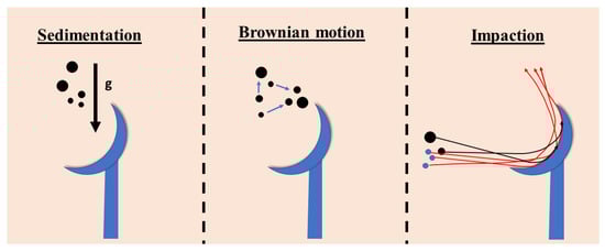 Sedimentation is the particle’s ability to settle, which depends on the ratio between the drag force that resists its movement and the gravity force that pulls on it. The particle reaches a final sedimentation velocity under stable environmental conditions [30]. Additionally, it is referred to as “gravitational settling”. This mechanism depends on particle size and the position of the system during the day. According to the definition of Brownian motion, which is a diffusion process, soil particles tend to be distributed equally throughout the medium depending on the temperature, nearby air molecules, and other aerosol components. This motion depends solely on the wind speed and is independent of environmental factors. Impaction occurs when particles’ inertia prevents them from following the flow’s curved streamlines, which leads to a collision with the obstacle. If the transferred momentum can overcome their kinetic inertia, the small particles that are interacting with an obstacle, in this case the PTC mirror, partially follow the direction of the air stream; if not, then they hit or impact the mirror’s surface. The impaction is proportional to the speed and direction of the wind, depending on the position of the system.
