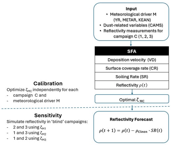 The soiling forecast algorithm (SFA) is evaluated in two stages: a calibration phase and a prediction phase. During calibration, the objective is to determine the optimal proportionality coefficient (ζ) by minimizing the RMSE between modeled and measured reflectivity for each meteorological driver (YR, METAR, KEAN). For improved clarity, the structure of the SFA is summarized in Figure 3 as a step-by-step process. Each stage of the model corresponds to a physically meaningful mechanism and includes both input preparation and output estimation.