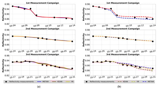 Estimated reflectivity derived from the soiling forecast algorithm for each measurement campaign utilizing different meteorological inputs, where (a) represents the calibration phase and (b) represents the prediction phase. The blue line corresponds to the simulation with METAR input, the red line to the simulation with KEAN input, and the orange line to the simulation with YR input, while the black dots represent the measured reflectivity.