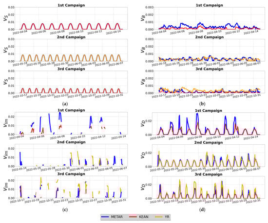Brownian motion exhibits deposition even at night. Its variability is primarily influenced by wind speed (V) and air temperature (T) proportionally to the factor VT2/3. Therefore, soiling accumulation from Brownian motion is very sensitive to the selected meteorological driver (Figure 5b) due to discrepancies among datasets. KEAN yields the lowest Brownian deposition, while METAR and especially YR produce higher contributions due to a systematic overestimation of the wind speed.