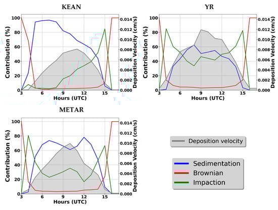 The total contribution of the soiling mechanisms to deposition velocity does not provide sufficient evidence on how the system is affected. For this reason, the hourly percentage contribution of each mechanism for the third measurement campaign—the only campaign for which all three meteorological drivers are available, to the average hourly deposition velocity was calculated. This analysis is presented in Figure 6, where the shaded area represents the average deposition velocity on an hourly basis, and the colored lines are the soiling mechanisms. This hourly temporal resolution analysis provides important insights into the functioning of each mechanism at specific times of the day.