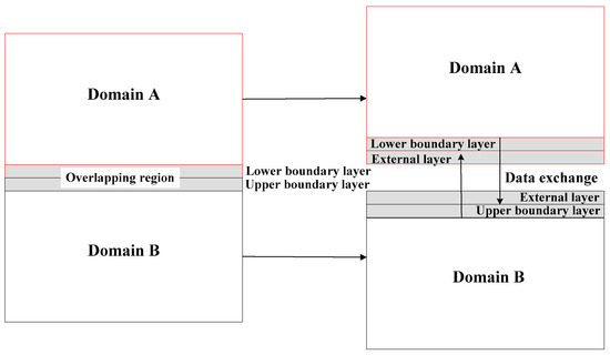 GPU acceleration is applied using explicit numerical schemes suitable for parallelization, as proved in [17,20,26]. Thus, the multi-GPU-accelerated parallel computing technique is applied in the model in this study to realize parallel simulations of rainfall, infiltration, and flow generation processes. A structured domain decomposition method is employed to distribute computational workloads across multiple GPUs. CUDA streams manage inter-device (GPU) communication for efficient data transfer. The two aforementioned approaches effectively address the challenges of data communication and exchange in multi-GPU computing, with the detailed computational processes described in our previous related study [31]. Firstly, the computational domain (M × N cells) is partitioned equally along the y direction into two subdomains (initially M/2 × N cells each), corresponding to the two utilized GPUs. To accurately handle flux calculations at the shared boundary between adjacent subdomains, where cells require data from neighboring cells residing on the other GPU, a one-cell-thick overlapping region is implemented. Then, the lower boundary of subdomain A (GPU 1) is extended by one row (1 × N cells) into the upper boundary region of subdomain B (GPU 2). This results in two final subdomains of size (M/2 + 1) × N cells each (Figure 1). These overlapping layers (gray areas in Figure 1) contain copies of the relevant boundary cells from the neighboring subdomain. This approach minimizes host-device memory transfers by allowing necessary inter-GPU data exchanges (specifically for these boundary cell values) to occur directly between devices, updating the overlapping layers prior to each computational step. This domain decomposition method is fundamental for facilitating efficient data exchange between GPU 1 and GPU 2, enabling effective multi-GPU parallel computation to enhance overall performance. All three cases employ the aforementioned domain decomposition method in this study.