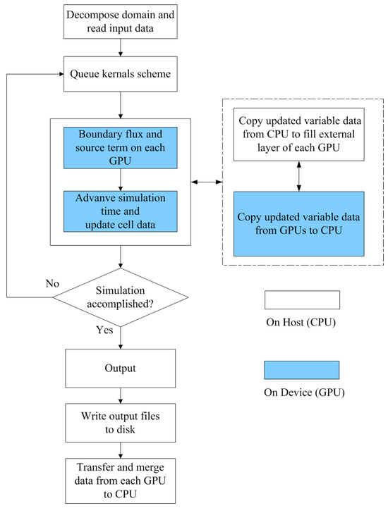 Figure 2 shows the processes of implementing GPU-accelerated parallel computing for a full hydrodynamic model. The modeling procedure includes initializing parameters (e.g., rainfall, water depth), partitioning the domain based on the GPU number, synchronizing overlapping cells, and executing simulations in parallel. Firstly, the input parameters are initialized, including the water depth and level, rainfall, and infiltration. The computational domain is partitioned into the same subdomains equal in number to the GPUs, the values of the neighboring cells in the overlapping regions between adjacent subdomains are populated, and all variables are then asynchronously copied from the CPU to each GPU. The CUDA stream method is employed to enable data exchange for each GPU, including the runoff amount, water level, and flow velocity of the flood. Data exchange between GPUs occurs directly through these overlapping halo regions. Finally, after the computational tasks are completed, the simulation data from each GPU are copied back to the CPU for merging to obtain the complete simulation results.