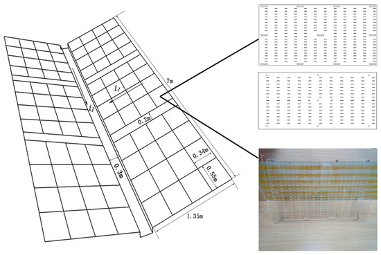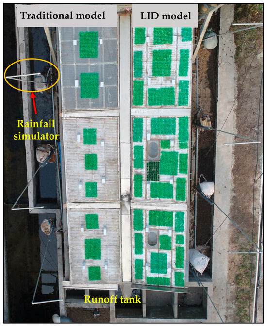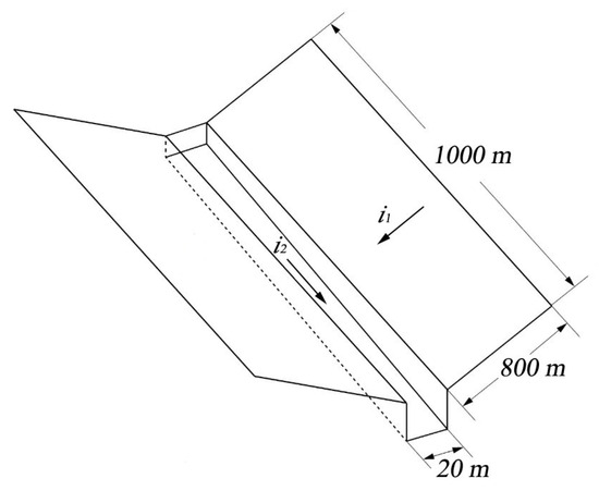 An experimental rainfall platform developed at Xi’an University of Technology (China) was used to assess the model’s accuracy in a controlled environment [38]. The experimental physical catchment model was designed based on the similarity theory from measured data of an actual road in Fengxi New City, Shaanxi Province, China. The experiment set up two simulation scenarios: LID (Low-Impact Development) and a traditional model with different surface patterns, showing the buildings, grasslands, roads, drainage channels, and runoff collecting tank (Figure 5). The traditional simulation scenario was selected to provide the data for the proposed model validation in this study, with an impervious simulated surface. Figure 6 shows a geometric graph of the simulated surface. The experimental platform had dimensions of 7 m × 3 m (length × width), while the watershed area of the traditional simulation scenario was 7 m × 1.65 m (length × width) and could be fully covered by the entire rainfall system, with a rainfall coverage area of 21 m2. The whole surface comprised 48 two-layer rectangular acrylic plates uniformly distributed along both sides of the experimental platform, with the upper layer of each plate measuring 0.54 m × 0.33 m (length × width). The simulated longitudinal slope (i1) and cross slope (i2) of the catchment could be adjusted via a steel frame support system, with both the longitudinal and cross slopes set at 5° in this experiment. A rainfall intensity of 0.47 mm/min was adopted in the experimental design. The rainfall duration was set to 12 min, with a total simulation period of 20 min. Manning’s roughness coefficients were obtained from the empirical parameters of similar experiments in the literature. The fine cell resolution was 0.01 m for this catchment.