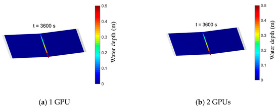 The simulated depth results showed good agreement between the simulations on one GPU and two GPUs at 5 m terrain resolution, with a relative error of 0 between the two computed depths, indicating the higher accuracy of the model. The rainfall–runoff visual simulations for the whole catchment were executed on one GPU and two GPUs, as shown in Figure 4. The accelerated computing efficiency results of the different simulations are summarized in Table 1, showing that the RS ratios were 1.27 and 1.57 times for the different simulations. The multi-GPU model had a higher RS ratio (1.57 times).
