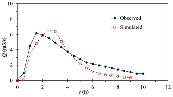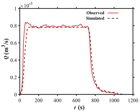 Figure 7 illustrates the observed and simulated runoff curve change processes for the traditional simulation scenario under the same longitudinal and cross slopes (5°), showing that the simulated runoff curve exhibits a similar change trend to the experimentally observed runoff variation. Meanwhile, the NSE value between the measured and simulated runoff under the traditional simulation scenario was calculated as 0.956, indicating that the result computed by the proposed model fits the measured value very well. The established model has high reliability and precision, as proved by it having the highest NSE value (near to 1).
