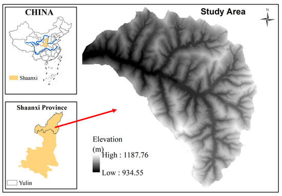 The high-resolution DEM is vital for setting up the proposed model. An unmanned aerial vehicle (UAV) equipped with a multi-camera system and LiDAR (Light Detection and Ranging) was used to obtain high-resolution DEM and land-use image data, obtaining a spatial resolution of 2 m data in the gully catchment on the Chinese Loess Plateau. Using ArcGIS 10.3 software, we plotted the location map of the study area and distribution maps of the high-resolution DEM and land-use classification. The gully catchment was classified into eight land-use categories using the classification tool in ArcGIS. In this study, constant rainfall intensities were applied to an idealized V-shaped catchment, and artificial rainfall experiments were conducted. Rainfall events with return periods of 5, 20, and 50 years were designed for the gully catchment.