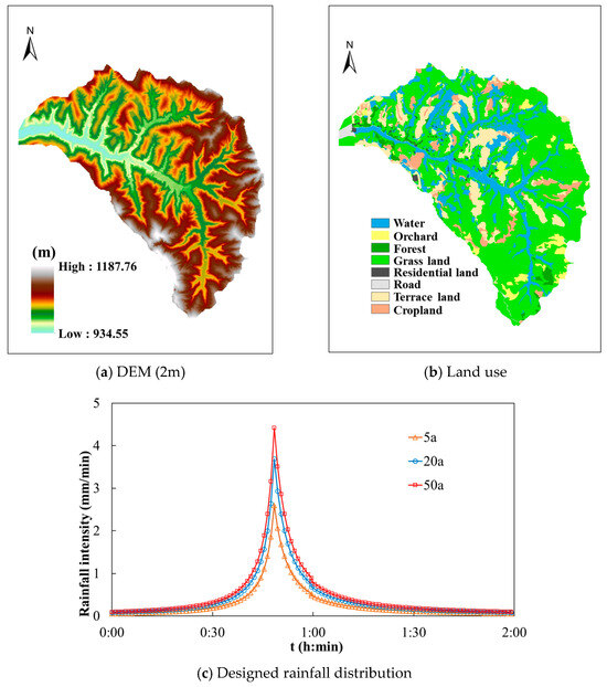 The Wangmaogou catchment (110°20′26″–110°22′46″ E, 37°34′13″–37°36′03″ N) is located in the southeastern of Yulin City, Shaanxi Province, China, and has a total area of approximately 5.97 km2 (Figure 8). Wangmaogou catchment is among China’s first experimental small watersheds to undergo treatment. The catchment exhibits elevations between 934 m and 1188 m. Its primary ditch is 3.75 km long with an average slope of 2.7% along the ditch bed. The rainy season is mainly concentrated from July to September. The watershed is characterized by a complex topography with densely distributed gullies on the Chinese Loess Plateau (CLP). The input datasets for the model contained a high-resolution DEM, observed and designed rainfall, land-use classifications with corresponding infiltration parameters, and Manning’s roughness coefficients. The observed rainfall event of 15 July 2012 was employed for the model validation. Designed precipitation events were used to test the model’s performance, with rainfall return periods of 5, 20, and 50 years. The high-resolution DEM data were obtained through unmanned aerial vehicle surveying, with a grid spatial resolution of 2 m (Figure 9a). The 5 m resolution data was calculated through spatial interpolation using ArcGIS. The domain was discretized into approximately 4.52 × 105 (5 m) or 2.83 × 106 (2 m) cells. The study area was classified into eight land-use categories, as presented in Figure 9b: water, orchard, forest, grass land, residential land, road, terrace land, and cropland. The infiltration and Manning coefficient values of the different land uses were assigned according to previous studies [21,39]. The duration of the simulated rainfall–runoff process was set to 14,400 s for all the different rainfall events, with return periods of 5, 20, and 50 a (Figure 9c).
