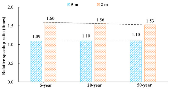 To further explore the speedup ratio of two GPUs relative to single-GPU computations, Figure 11 displays the RS ratios for two-GPU parallel computing at terrain resolutions of 5 m and 2 m, with computation cell numbers of approximately 4.52 × 105 and 2.83 × 106, respectively. For the 5 m resolution, the RS ratios range from 1.09 to 1.10, indicating a smaller RS ratio for the simulation at smaller grid-computational scales. However, at 2 m resolution, the RS improves significantly to between 1.53 and 1.60, confirming the benefits of two GPUs for processing large-scale and high-resolution flood simulations. Moreover, the model demonstrates 28.7-times acceleration compared to the simulation time (14,400 s) when running on two GPUs, which significantly enhances its early prediction capability for rainfall flood events. The results indicate that multiple-GPU computing exhibits greater acceleration ratios and superior computational performance in larger-catchment-scale flood simulations. In all, with a higher terrain resolution and a greater number of computational grid cells in the watershed, the acceleration efficiency in the flood simulation is more significant.