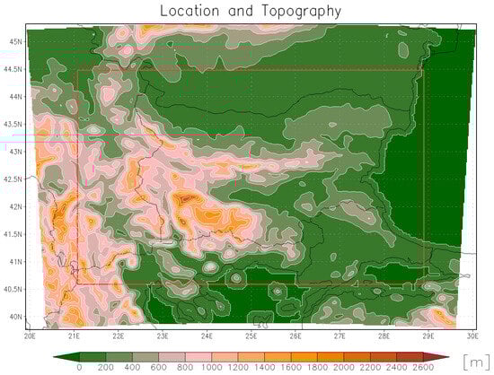 Bulgaria is located in Southeastern Europe, occupying a transitional zone between the continental climate of Central Europe and the Mediterranean climate to the south. Its diverse topography—including mountain ranges such as the Balkan Mountains, Rila, Rhodope, and Pirin, as well as lowland regions like the Danubian Plain and Thracian Valley—significantly influences regional climate patterns. Precipitation varies widely across the country, both spatially and seasonally, with higher amounts typically observed in mountainous areas due to orographic lifting, and lower totals in the plains and southeastern regions. The country is also affected by Mediterranean cyclones and convective summer storms, contributing to both seasonal rainfall and extreme precipitation events. This climatic complexity makes Bulgaria particularly sensitive to projected changes in precipitation patterns under future climate scenarios. Bulgaria’s geographical location and diverse terrain make it particularly vulnerable to climate variability and extreme weather events. Regional studies indicate increasing and intensifying heavy rainfall in the Balkans [,,], consistent with broader trends observed across the Mediterranean. Therefore, high-resolution modeling is essential to accurately capture localized precipitation patterns and assess the potential impacts of climate change.