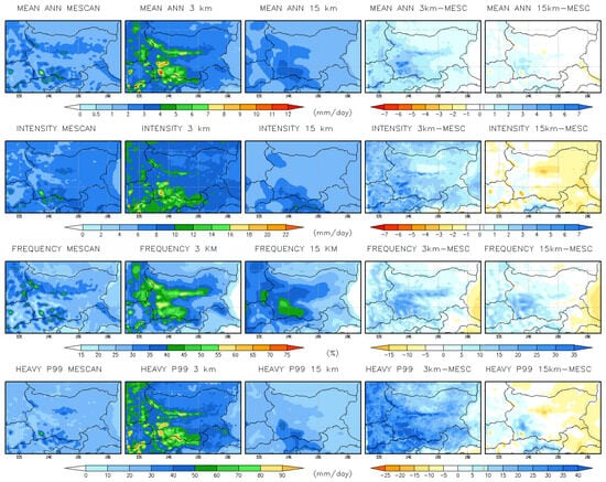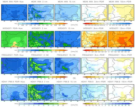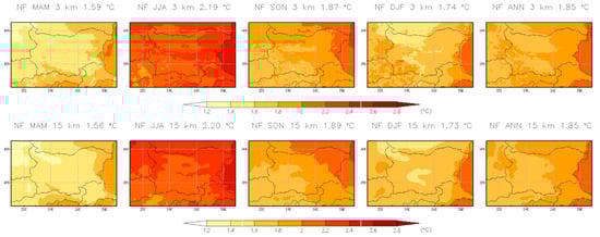 A set of well-known precipitation indices is applied to assess projected future changes. Table 1 provides an overview of the indices used. These indices include mean daily/hourly precipitation, wet day/hour intensity and wet day/hour frequency, and heavy daily and hourly precipitation, defined as the 99th percentile (p99) and the 99.9th percentile (p99.9), respectively. A wet day (hour) is defined as a day (hour) with precipitation exceeding 1 mm/day (>0.1 mm/hour). Percentiles are based on the values of all events, both wet and dry, over the entire 10-year period []. For the evaluation of the kilometer-scale simulation, observational data were interpolated onto a 3 km grid using the distance-weighted interpolation method. For the assessment of the coarse-resolution simulation, the data were interpolated onto a 15 km grid. The Climate Data Operator tool (CDO) [] was used for this purpose. To assess annual and seasonal changes in precipitation, the indices are calculated annually (ANN) and seasonally, with March–April–May (MAM) used for spring, June–July–August (JJA) for summer, September–October–November (SON) for autumn, and December–January–February (DJF) for winter.