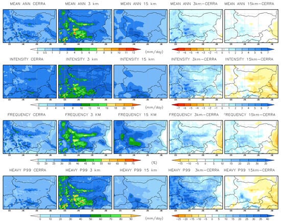 A comparison of annual mean daily precipitation indices from CERRA reanalysis datasets (https://cds.climate.copernicus.eu/datasets/reanalysis-cerra-land?tab=overview, accessed on 25 April 2025), and simulations (15 km RCM and 3 km CPRCM), along with mean biases for the historical period 1995–2004 are shown in Figure 3. The annual mean biases (Table 3) indicate that the RCM underestimates all precipitation indices, except for frequency, by approximately 12–17%. In contrast, the CPRCM overestimates all indices, with intensity increasing by ~31%, mean precipitation by ~54%, and heavy precipitation (p99) by ~74%. Specifically, the RCM underestimates mean precipitation by ~12%, intensity by ~17%, and heavy precipitation by ~15%. Overall, these results suggest that while the convection-permitting model (CPRCM) more effectively captures precipitation frequency and extremes, it tends to overestimate precipitation amounts and intensities, whereas the coarser RCM underestimates most metrics.
